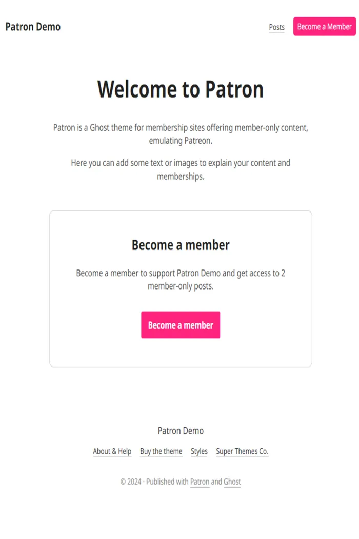 Super Themes Co. presents Patron, a Ghost CMS theme designed to help creators offer exclusive, member-only content. It's like having your own Patreon, but with more control and customization.