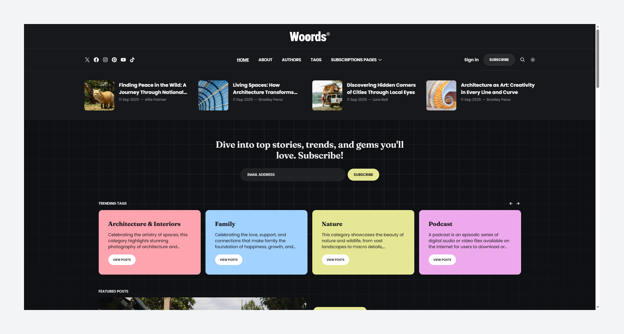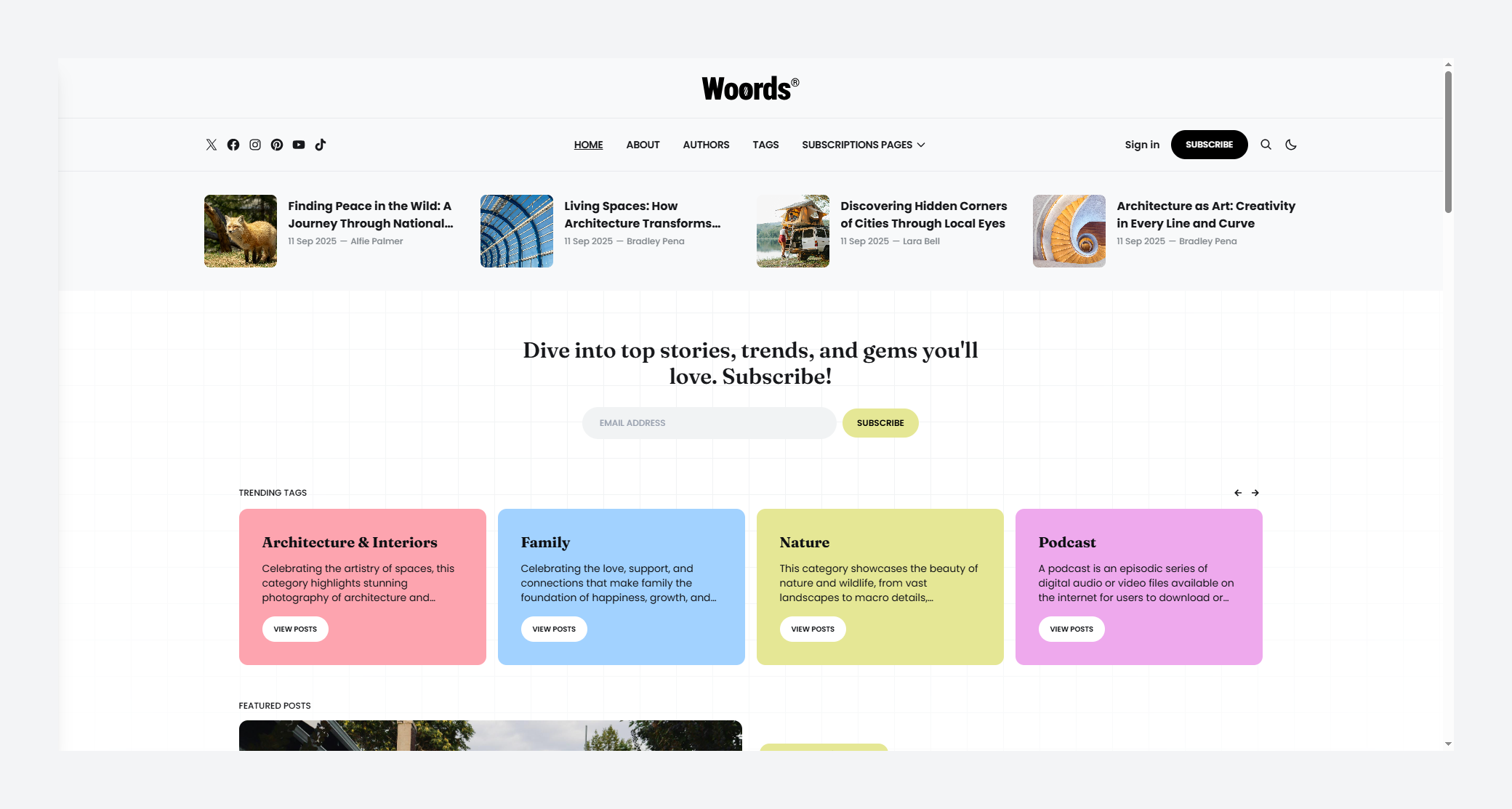 Woords combines a no-nonsense grid magazine layout with Ghost-native membership flows (custom auth pages, subscribe card, previews for paid posts) so you can publish and monetize without third-party hacks.